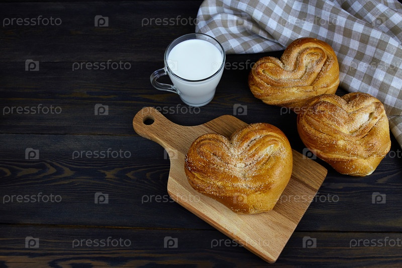 Домашняя выпечка и чашка молока на деревянной доске на темном фоне