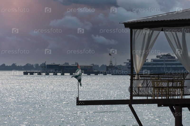 Морской пейзаж с кафе у моря и абхазским флагом