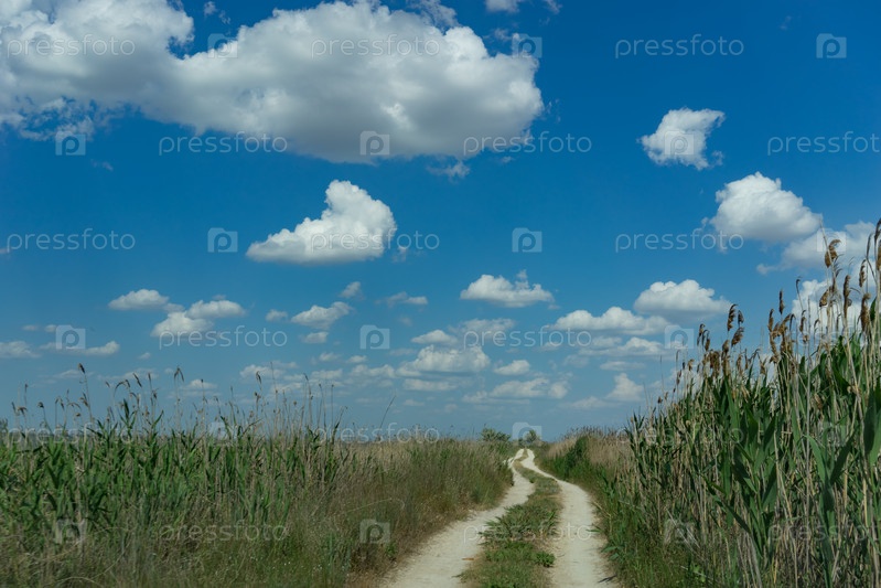 Грунтовая дорога посреди камыша под голубым небом