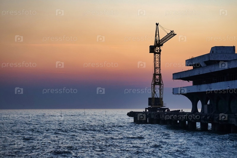 Морской пейзаж с видом на закат и краном у здания. Сухуми, Абхазия