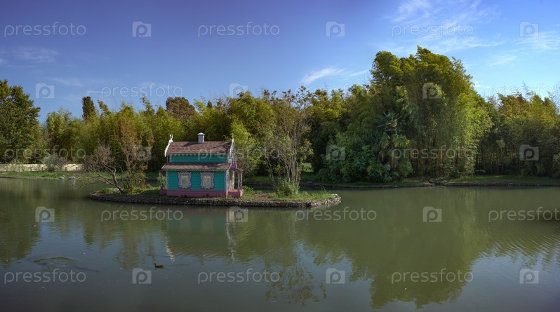 Большой пруд с островком посередине и домиком для птиц