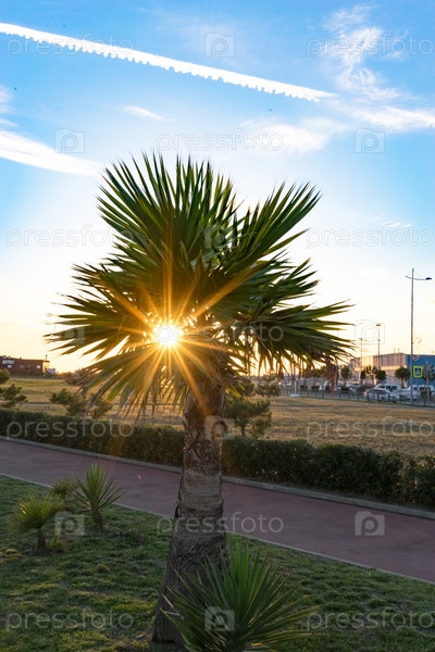 Солнце светит сквозь листья пальмы на фоне городского пейзажа