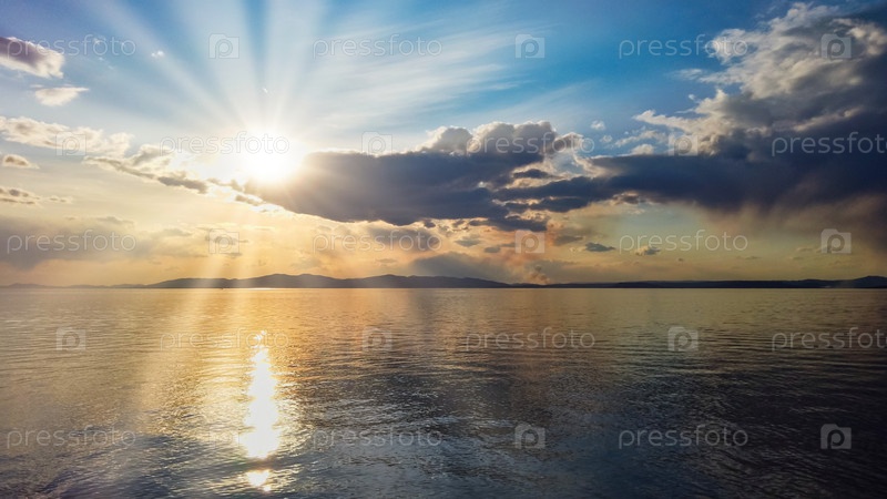 Морской пейзаж с красивым солнцем на закате, отраженным в море. Путешествия и туризм