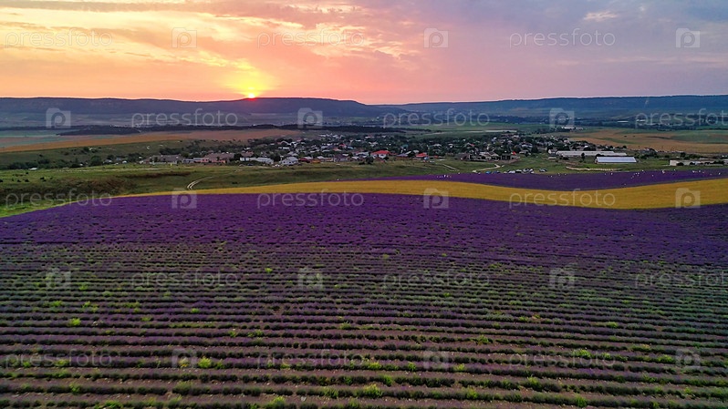 Вид с воздуха на лавандовое поле в лучах красивого заката