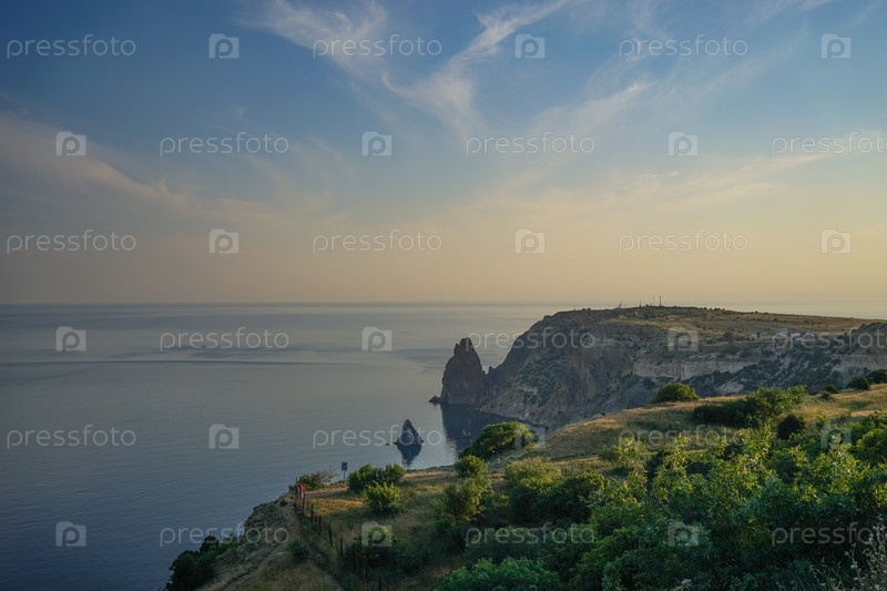 Морской пейзаж с береговой линией, покрытой растительностью
