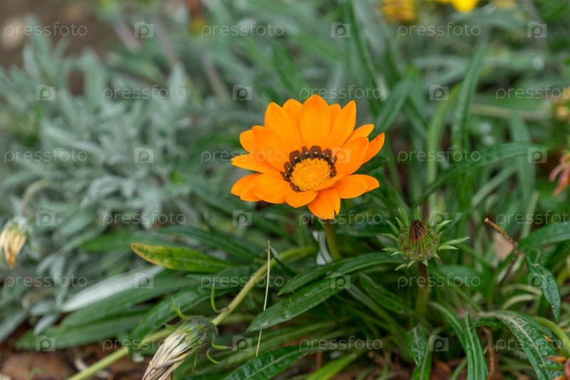 Оранжевый цветок календулы на фоне зеленых листьев