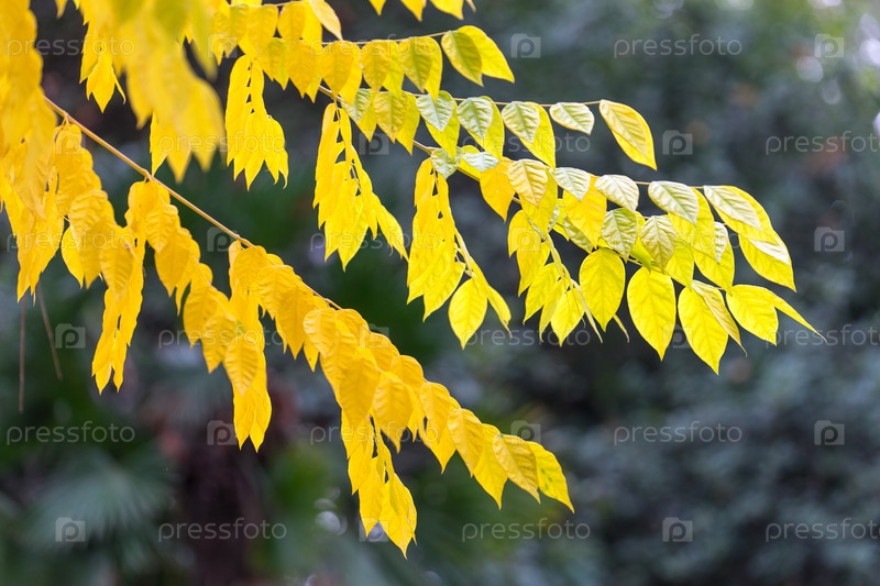 Естественный фон с ветвями деревьев и ярко-желтыми листьями на размытом фоне
