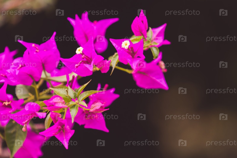 Ярко-розовые цветы бугенвилии на размытом зеленом фоне с боке. Россия, Сочи