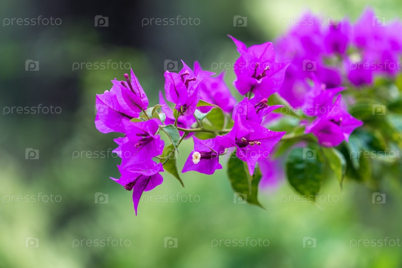 Ярко-розовые цветы бугенвилии на размытом зеленом фоне с боке