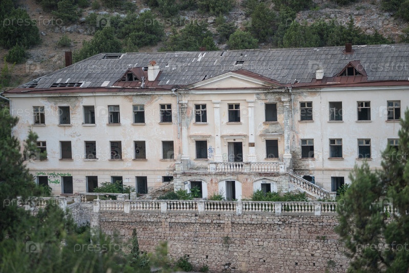 Разрушенное здание в Балаклаве на фоне гор