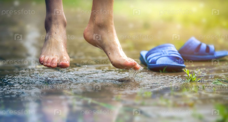 Босые ноги мальчика и по щиколотку в грязной луже