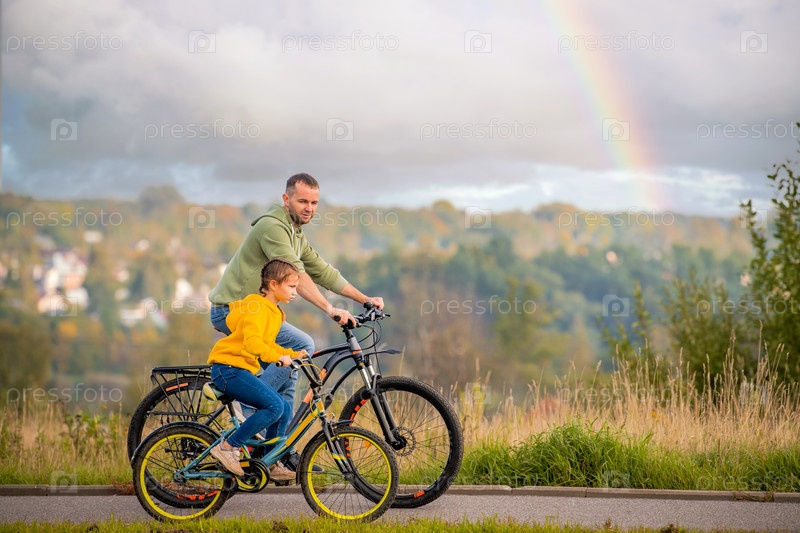 Счастливые отец и дочь осенью катаются на велосипеде на природе