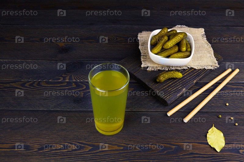 Огуречный рассол или соленый сок в стекле, миска с маринованными корнишонами на деревянном фоне. Трендовый напиток