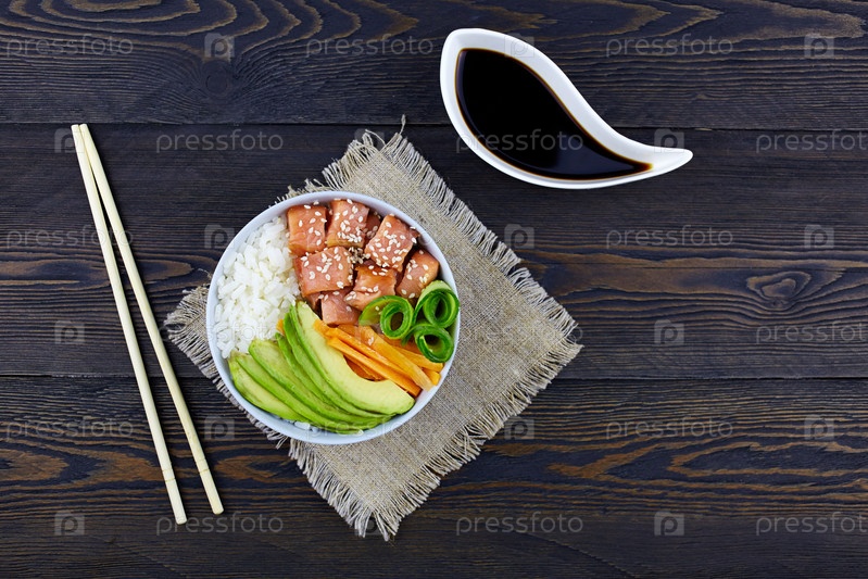 Гавайская миска из лосося с рисом, авокадо, огурцом, морковью, соевым соусом на темном деревенском фоне