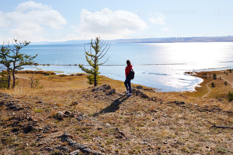 Женщина с рюкзаком любуется прекрасным видом на озеро