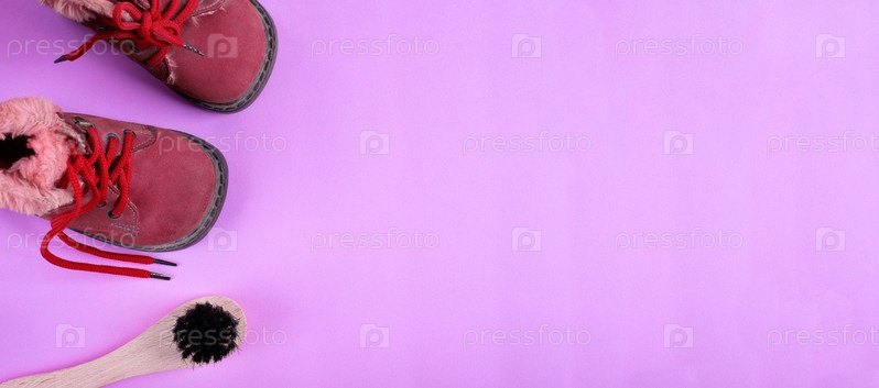 Веб-баннер с нубуковыми ботинками и щеткой для чистки обуви на розовом фоне. Аксессуар для ухода за обувью. Вид сверху. Макет с копией пространства