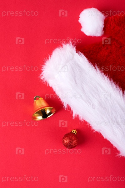 Шляпа Санты, золотой колокольчик и безделушка на красном фоне. Рождественская и новогодняя плоская планировка
