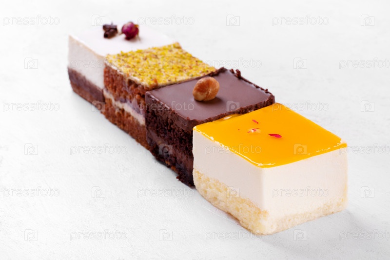 Четыре разных торта на белом столе. Муссовый торт с маракуйей, шоколадом, фисташками и чизкейком. Набор десертов размером с порцию