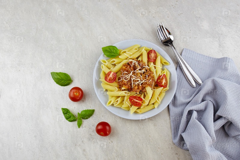 Классическая итальянская паста Болоньезе с помидорами и базиликом на тарелке на светлом фоне