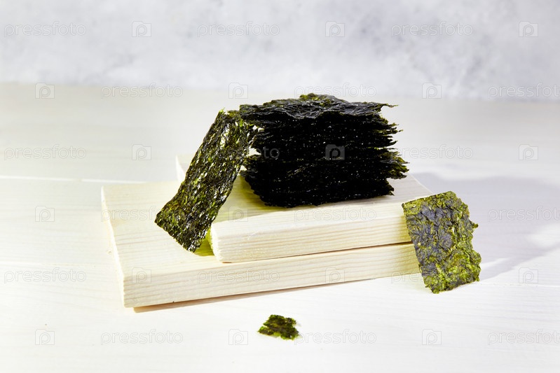 Хрустящие водоросли нори на белом деревянном фоне. Традиционные японские листы из сухих водорослей