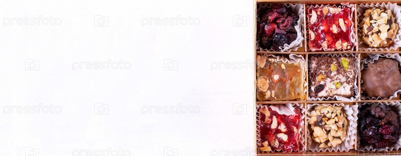 Веб-баннер с рахат-лукумом в коробке. Красочная кондитерская вариация. Восточный десерт. Макет с копией пространства на белом фоне