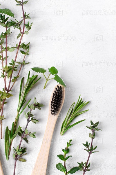 Бамбуковая зубная щетка с черной щетиной и травами на белом фоне. Гигиенический инструмент из биоразлагаемых экологически чистых материалов. Копировать пространство