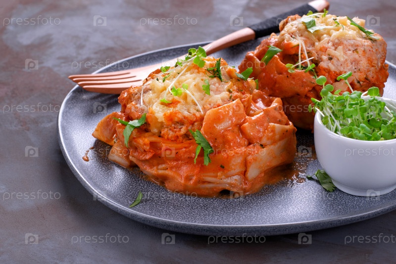 Гнезда фетучини с фрикадельками, сыром и томатным соусом подаются с микрозеленью на серой керамической тарелке. Горячая паста