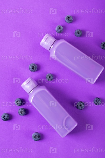 Гель для душа с черникой в двух флаконах на фиолетовом. Макет с немаркированным средством по уходу за телом или жидким моющим средством с натуральным ингредиентом. Монохромная плоская планировка