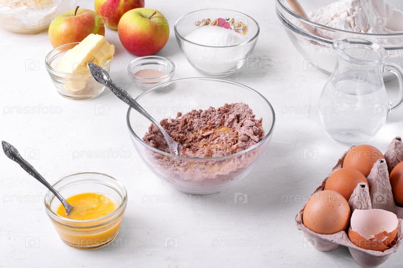 Приготовление песочного шоколадного теста в стеклянной посуде. В смесь муки, масла, какао-порошка, сахара добавляем яйцо. Пошаговый рецепт печенья