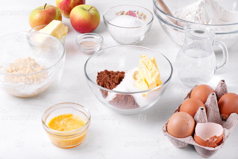 Приготовление песочного шоколадного теста в стеклянной посуде. Смешать муку, масло, какао-порошок, сахар и яйцо. Набор ингредиентов. Пошаговый рецепт печенья