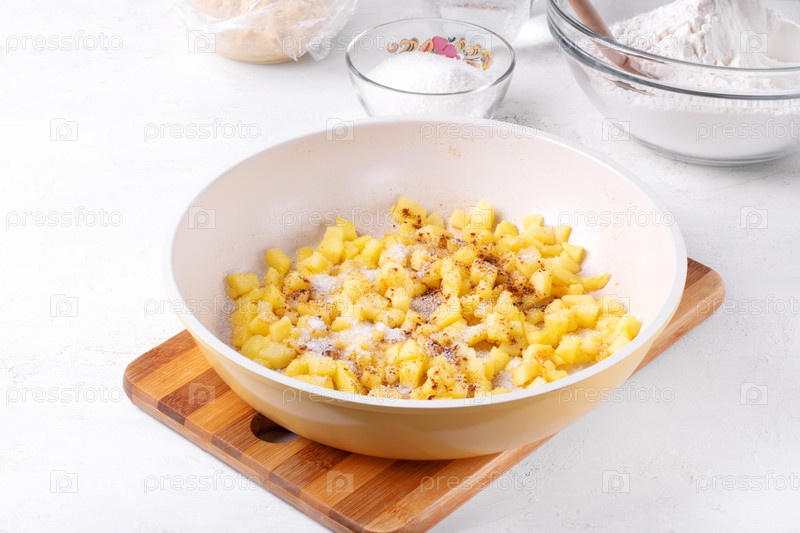 Приготовление яблочной начинки для пирогов или булочек. Кусочки фрукта обжаривают на сковороде с маслом, корицей и сахаром