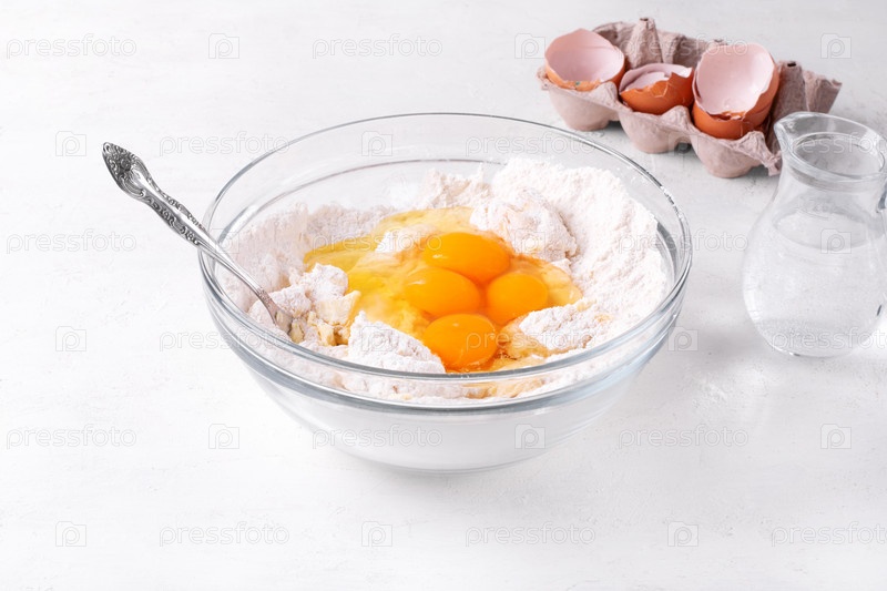 Замешивание теста для хлебобулочных изделий. Добавление яиц в дрожжевое тесто в стеклянной посуде. Готовим булочки, кулич или пирог. Пошаговый рецепт. Шаг 4