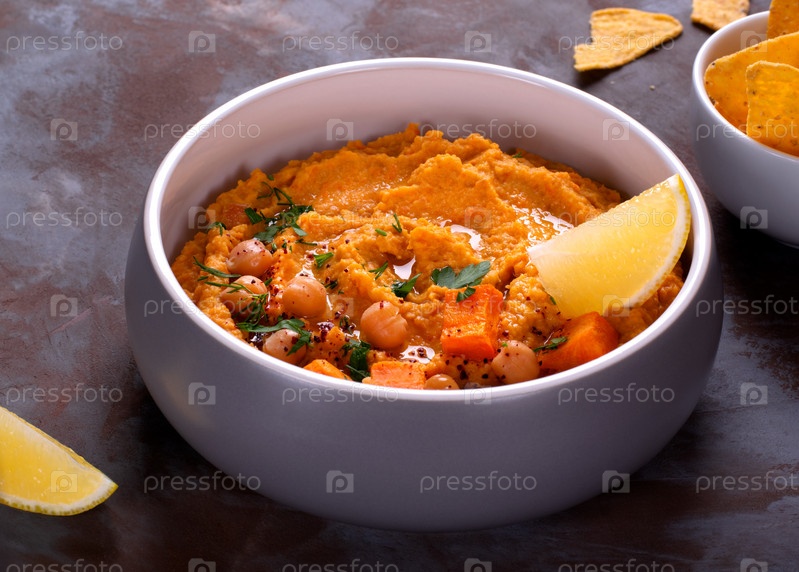 Хумус со сладким картофелем, нутом, тахини, чесноком и оливковым маслом, увенчанный ломтиком лимона, травами и сумахом. Блюдо ближневосточной кухни