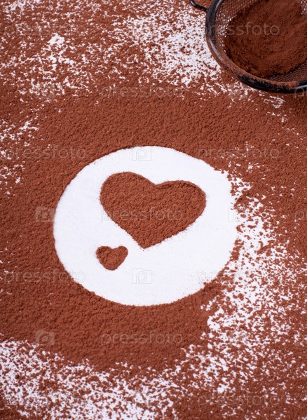 Форма сердца из какао-порошка на белом столе. Хлебопекарный и кондитерский ингредиент