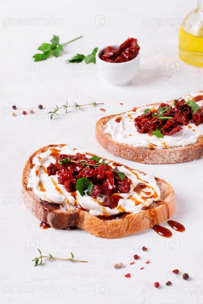 Брускетта с вялеными помидорами и сливочным сыром на ломтике хлеба чиабатта, украшенная бальзамическим соусом на белом столе. Закуска средиземноморской кухни
