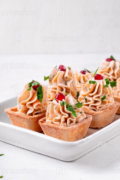 Закуски с паштетом из морепродуктов в тарталетках, украшенные зернами граната и петрушкой на белом столе. Праздничная закуска размером с порцию