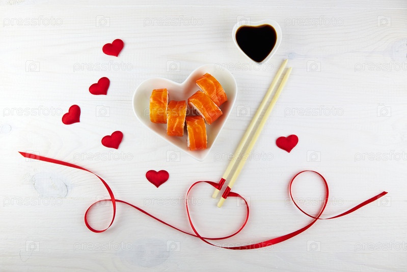 Суши на День святого Валентина в тарелке в форме сердца на белом деревянном фоне. Палочки с красной лентой, украшения-сердечки