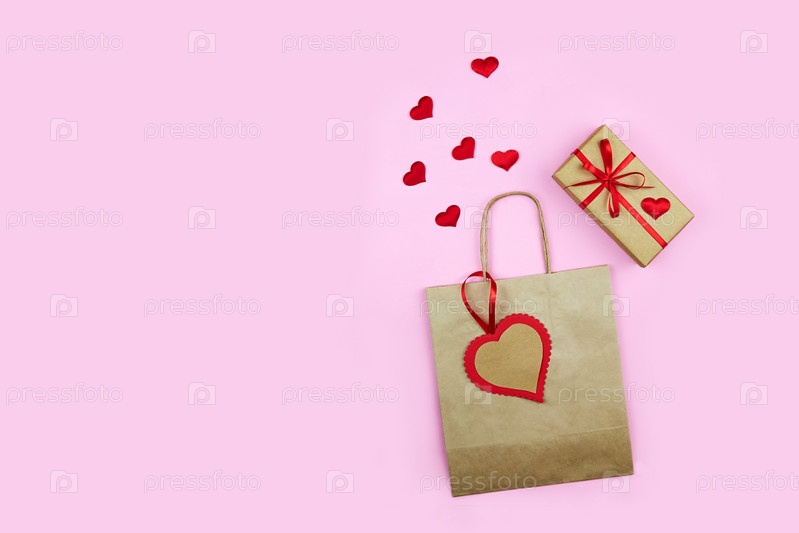Ремесленная упаковка и подарочная коробка, украшение сердца на розовом фоне. День Святого Валентина, День рождения, День матери