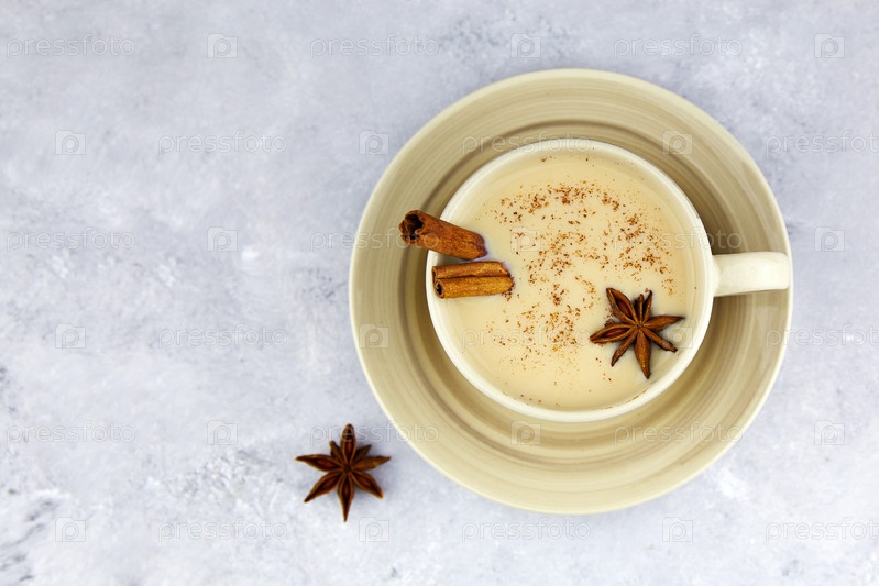 Чай масала. Традиционный индийский горячий напиток-чай масала со специями на светлом фоне