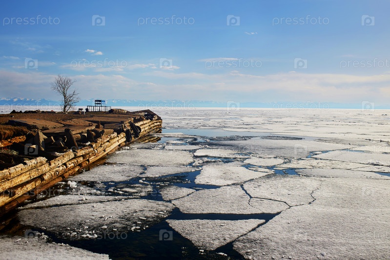 Старый деревянный пирс. Льдины и открытая вода. Байкал весной