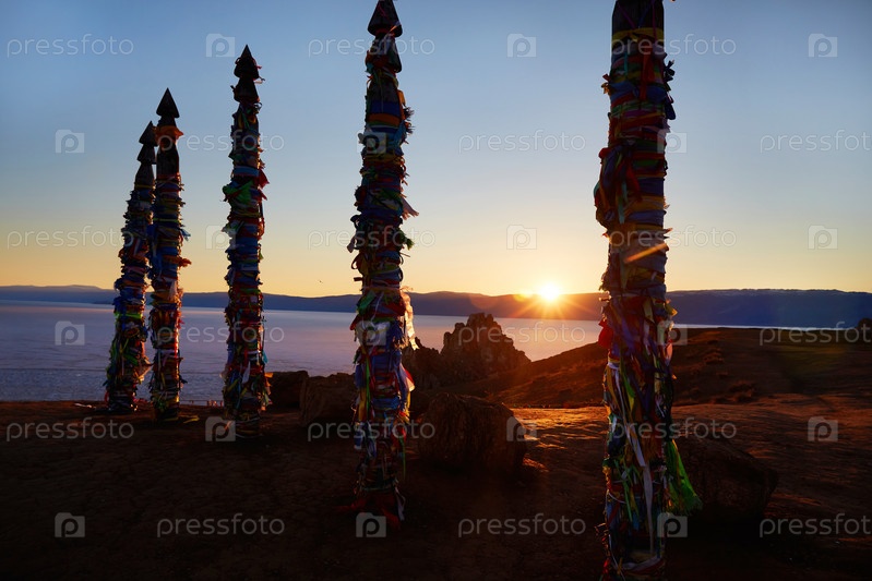 Деревянные ритуальные столбы с красочными лентами на мысе Бурхан или скале Шаманка