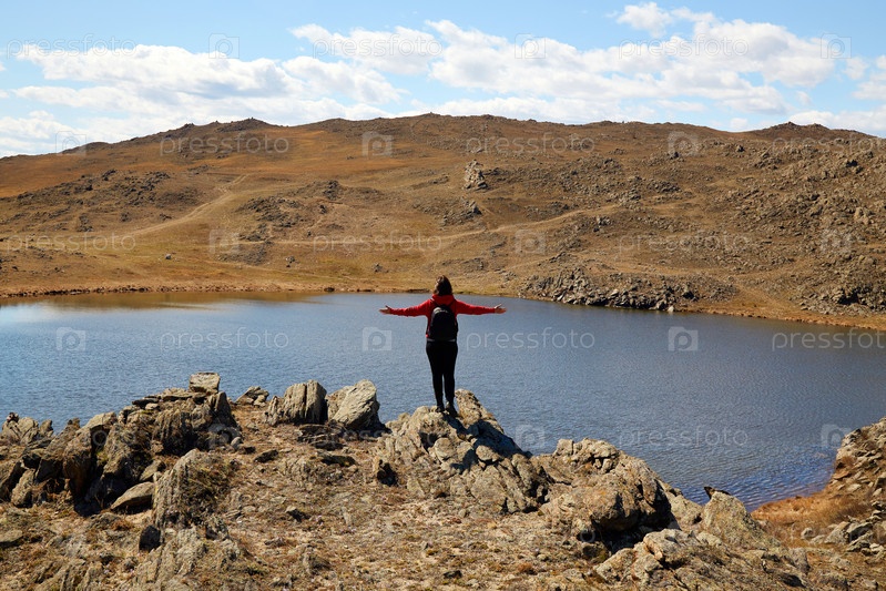 Девушка-путешественница стоит на скале и наслаждается прекрасным видом на озеро