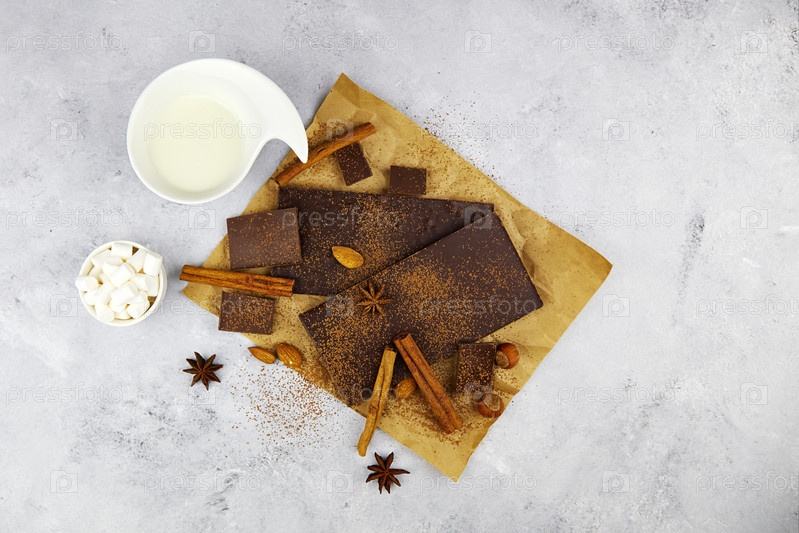 Ингредиенты для приготовления горячего шоколада. Шоколад, какао-порошок, корица, анисовая звезда, зефир и молоко