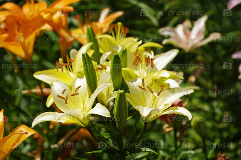 Красивые цветущие лимонные лилии под ярким летним солнцем