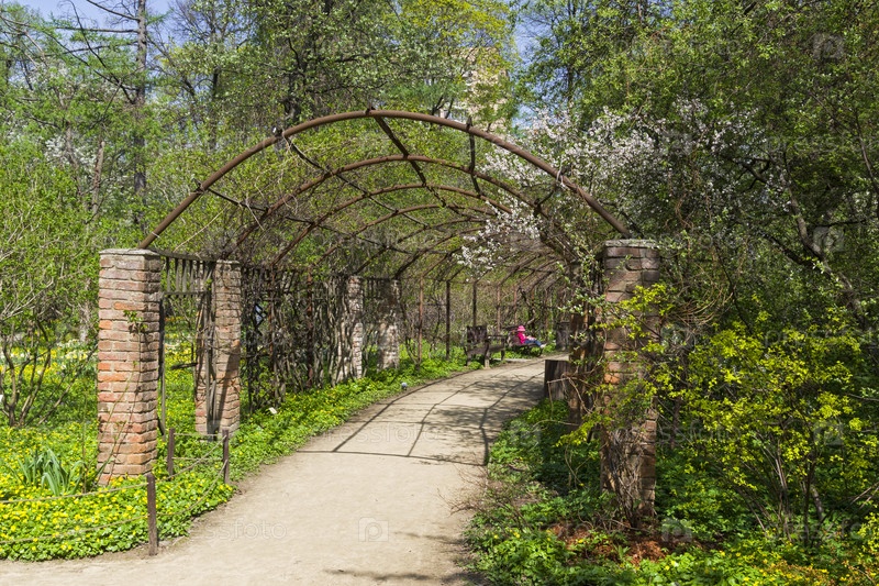 Пергола в парке. Солнечный день в мае. Москва, Аптекарский Огород (филиал ботанического сада МГУ)