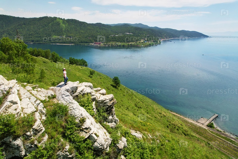 Красивый летний пейзаж озера Байкал. Девушка-путешественница стоит на горе