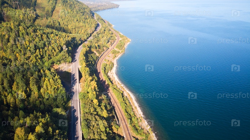 Красивый пейзаж с воздуха. Дорога и железная дорога вдоль озера