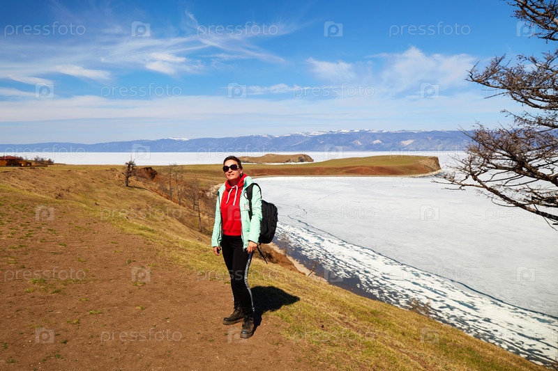 Байкал весной. Время таяния льда на озере. Женщина, путешествующая одна по острову Ольхон
