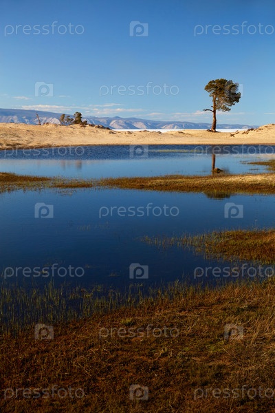 Красивый пейзаж. Небольшое озеро посреди песчаного пляжа