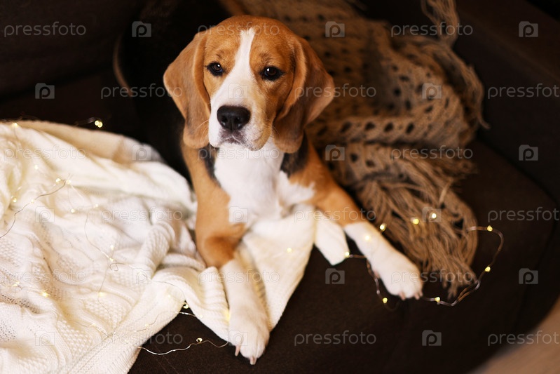 Милый пес бигль лежит на диване, вязаное одеяло